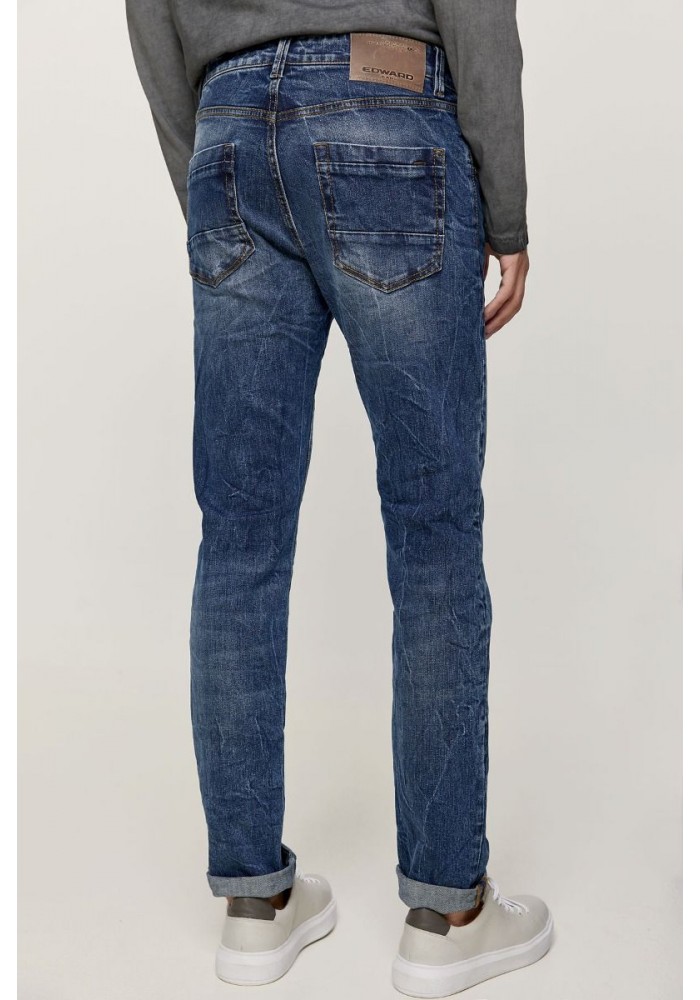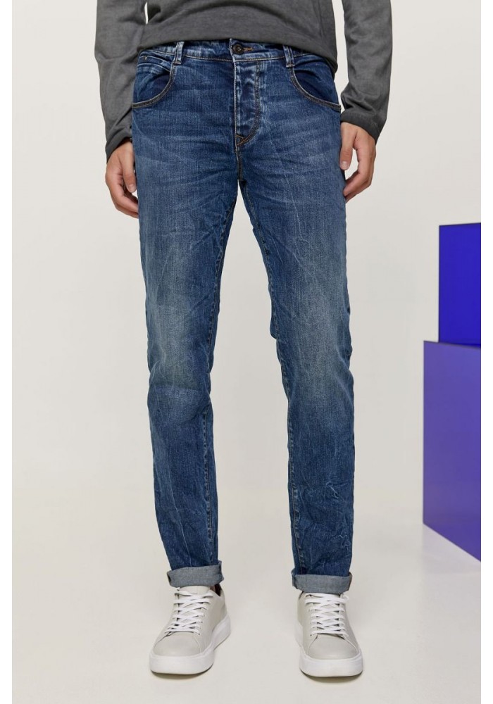 Τζιν παντελόνι σε slim γραμμή με 5 τσέπες. Ξέβαμμα στα μπατζάκια. Μήκος cropped. Κλείσιμο μπροστά με μεταλλικά κουμπιά.